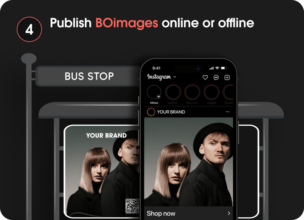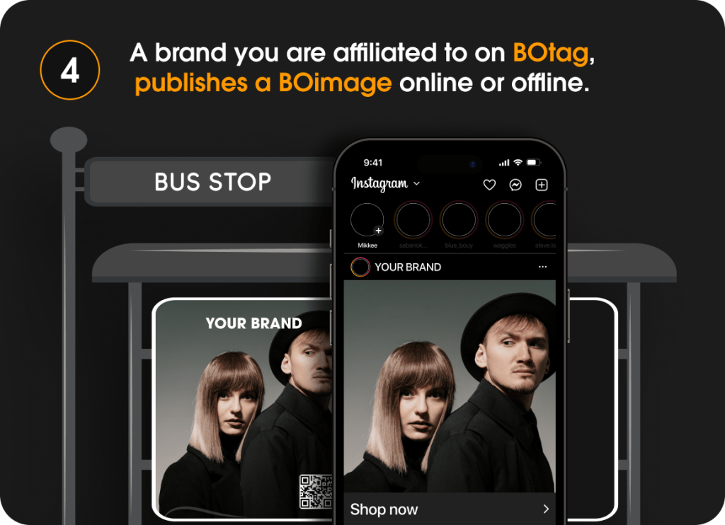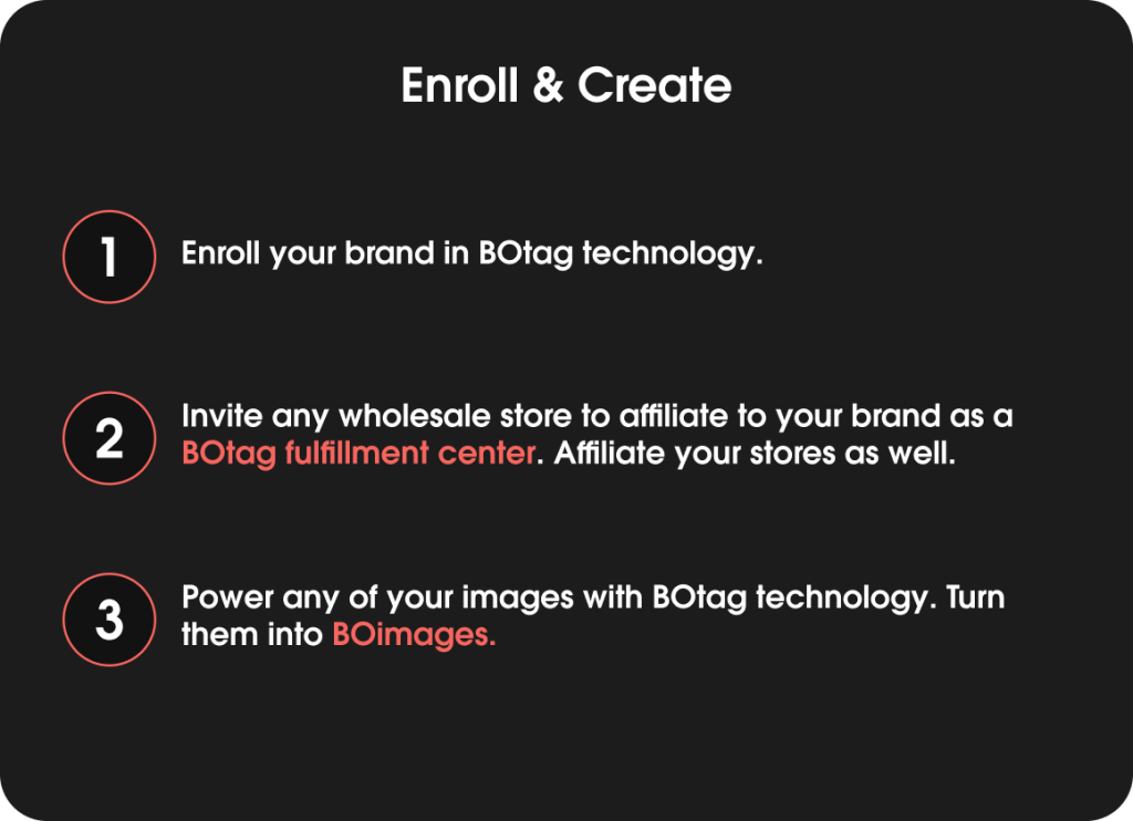 By enrolling in BOtag technology, your stores and wholesale network can sell your products directly from any offline or online images you publish, without the need for an e-commerce platform. This allows for a seamless transition from image to checkout in a physical store, owned by you or by any wholesale store selling your brand.