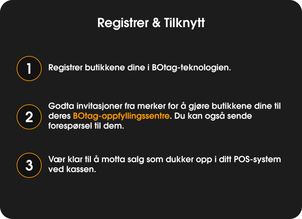 På din BOtag-teknologikonto kan du generere invitasjoner som sendes via e-post. Hver butikk må følge retningslinjene gitt i e-posten. Du vil bli varslet når en butikk er klar til å bli et oppfyllingssenter.