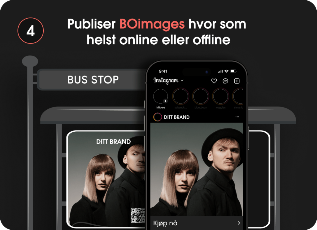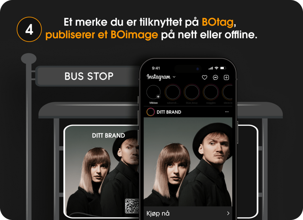 Når bildene drives av BOtag-teknologi, vil hvert bilde ha et HeyBO-merke og en QR-kode (hvis publisert offline; på busstop, i magasiner osv) som leder kundene til den eksepsjonelle HeyBO-handleopplevelsen.