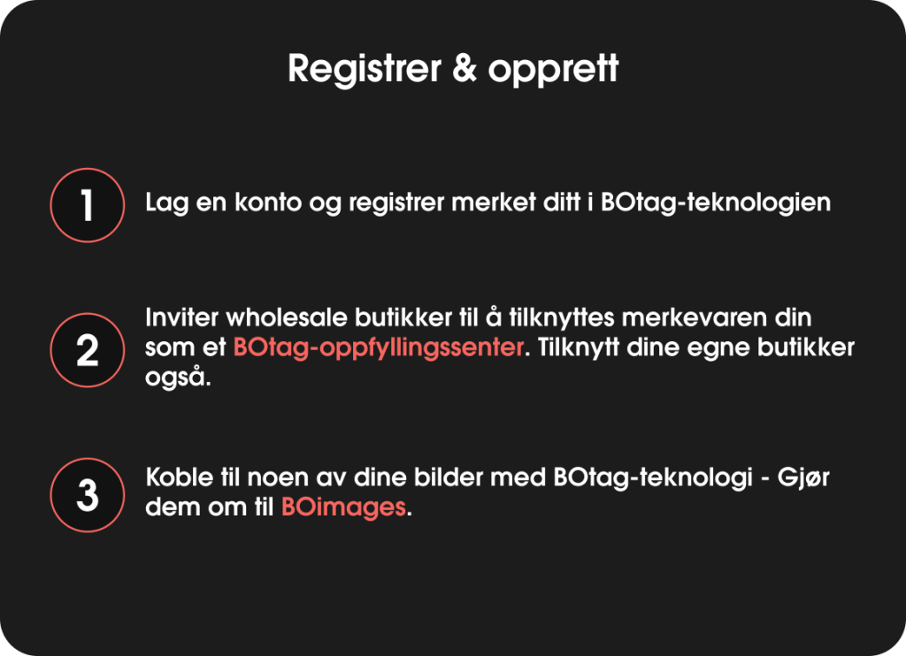 Ved å registrere deg i BOtag-teknologi kan butikkene dine og retailnettverket ditt selge produktene dine direkte fra bilder du publiserer, enten offline eller online, uten behov for en e-handelsplattform. Dette muliggjør en sømløs overgang fra bilde til utsjekk i en fysisk butikk, eid av deg eller av en hvilken som helst retailer som selger merkevaren din.
