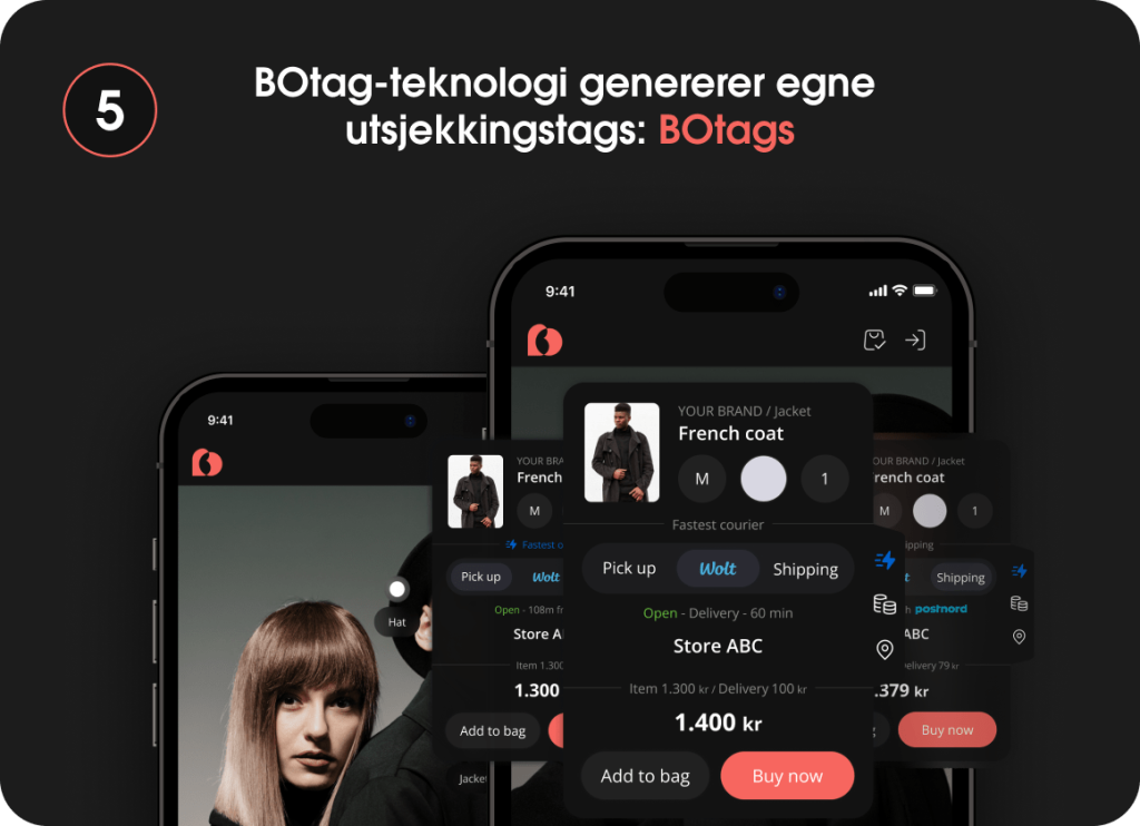 Merkene du selger, legger ut bilder av produktene deres, drevet av BOtag-teknologi, enten online eller offline. Hvis butikken din har varen som er valgt av kunden fra et av disse bildene, vil den dukke opp på BOtag’en, og kunden kan fullføre kjøpet fra butikken din med bare to klikk.